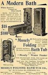 Mosely Folding Bath Tub Ryan spotted this very interesting folding antique tub on eBay and thought you would enjoy it. I’ve seen folding beds many times before but did not know a tub was ever designed to do it as well. The auction has ended but I think it will be back up for sale if you are interested and have lots of money to spend. You can view the original auction here. It would work quite well in a small home. Thanks Ryan for sharing this with us. Own a fabulous piece of American history…The Mosely Folding Bath Tub manufactured by the Mosely Folding Bath Tub Company in Chicago, Ill. in the mid 1880’s. In near perfect condition with a ten gallon copper tank, heated by a small kerosene burner. Clearly a luxury from another century. Included: Original tub stopper, original bath brush with “How to use” instructions on handle, and original advertisement. Tub and solid maple cabinet approximate dimensions Width: 29 inches, Depth: 25 inches, Height: 77 inches.