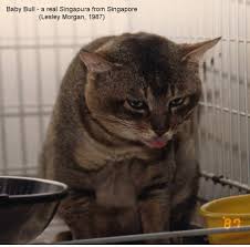 2014 - 2015Best of Breed BEST OF BREED CAT RW SGC PSEPIA CECILSABLE TICKED TABBY BEST OF BREED KITTEN JUCIFUL VONJI TWO OF SYMPHORIANESABLE TICKED TABBY BEST OF BREED ALTER RW QGCA BEAUTYMUS GOLIATH THE SINGA-PURR/CFSABLE TICKED TABBY Large celadon eyes twinkling with mischief in an angelic face help the Singapura reach out and capture the imagination while stealing the heart. These delightful delicate-looking cats dressed in the colors of the old sepia photographs are into everything looking up at you with big innocent eyes when you find them engaged in some mischief. No matter what, the combination of those eyes and their enchanting personality quickly has you forgetting their antics and reveling in their affection. The Singapura is the smallest breed of cat but is an energy-packed companion that wants to help you with everything you do. In 1991, the government of Singapore recognized the cats as a living national treasure. The Singapura, whose name is Malaysian for Singapore, originates from Singapore in South East Asia where the ticked coat pattern and dark brown color are a common local combination recognized as the original gene pool for ticked tabbies.